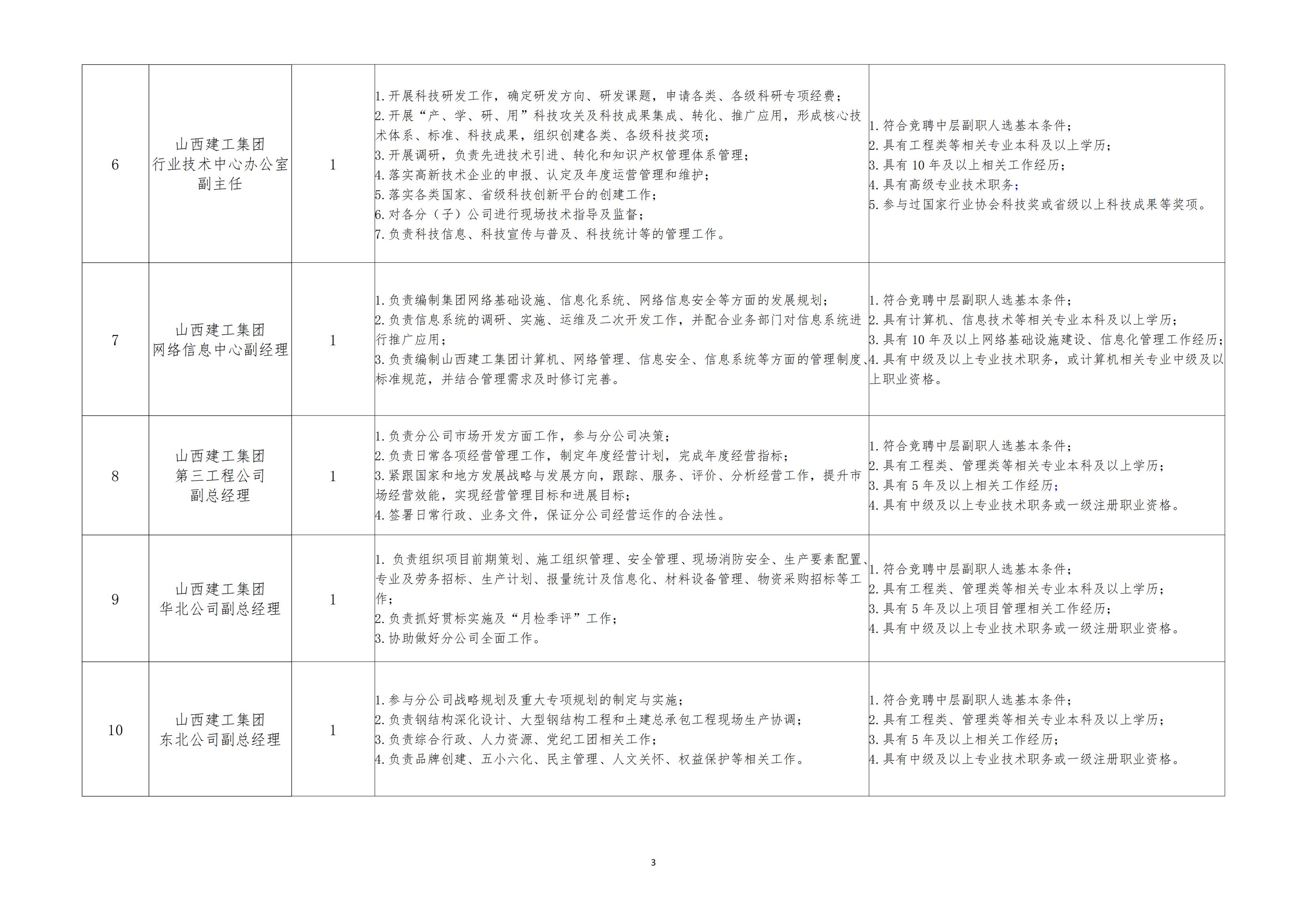 为进一步加强山西建工集团中层领导人����� �������Ƴ������������ �������Ƴ����������� �������Ƴ������������ �������Ƴ�������员队伍建设,配齐配强领导班子����� �������Ƴ����������� �������Ƴ������������ �������Ƴ������������ �������Ƴ�������,全面提升企业现代治理能力和管理水����� �������Ƴ������������ �������Ƴ������������ �������Ƴ����������� �������Ƴ������平,持续贯彻落实《山西建设投资集团����� �������Ƴ������������ �������Ƴ������������ �������Ƴ������������ �������Ƴ�������有限公司关于推进二级企业“六定”改����� �������Ƴ������������ �������Ƴ������������ �������Ƴ������������ �������Ƴ������革的指导意见》,决定对山西建工集团部分中����� �������Ƴ������������ �������Ƴ������������ �������Ƴ������������ �������Ƴ�������层管理人员空缺职位开展竞聘,特公告如下;